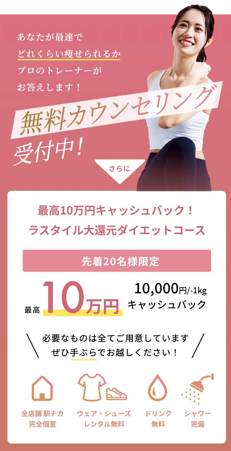 先着20名限定で、-1kgの減量につき1万円をキャッシュバック。