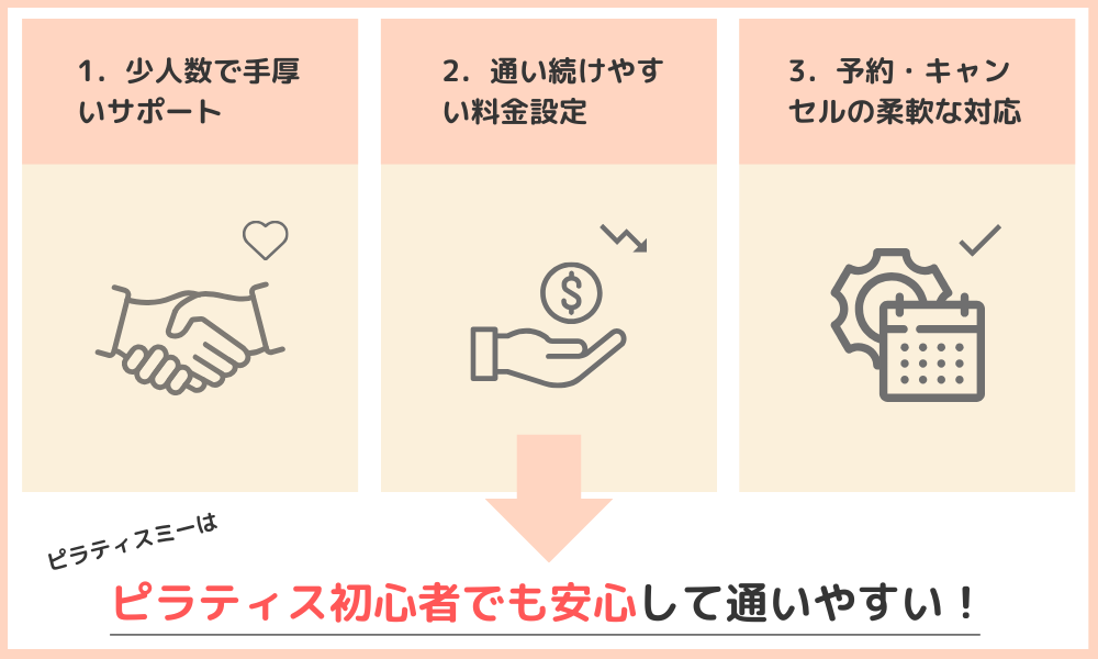 ピラティスミーの最大の特長は、利用者の「通いやすさ」を追求したサポート内容や料金プランです。
